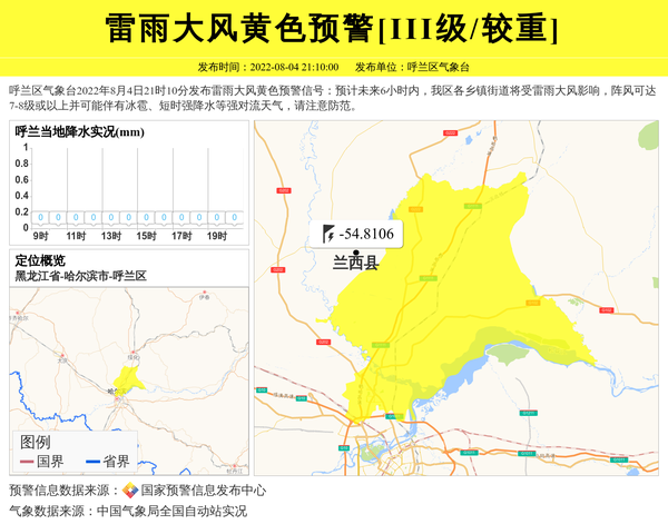 呼兰区气象台2022年8月4日21时10分发布雷雨大风黄色预警信号:预计未来6小时内,我区各乡镇街道将受雷雨大风影响,阵风可达7-8级或以上并可能伴有冰雹、短时强降水等强对流天气,请注意防范。 信息来源:国家预警信息发布中心; 发布单位:呼兰区气象台。