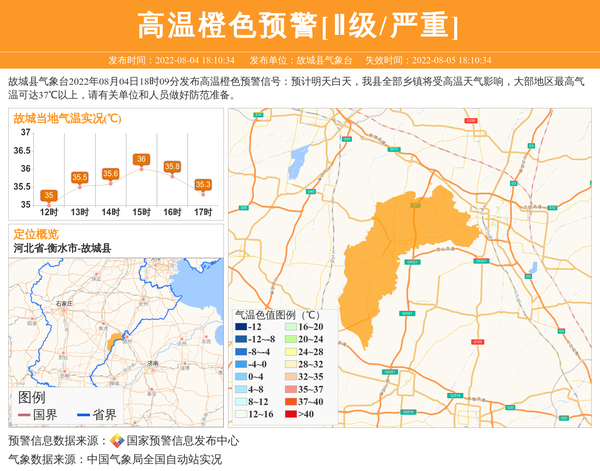 故城县气象台2022年08月04日18时09分发布高温橙色预警信号:预计明天白天,我县全部乡镇将受高温天气影响,大部地区最高气温可达37℃以上,请有关单位和人员做好防范准备。 信息来源:国家预警信息发布中心; 发布单位:故城县气象台。