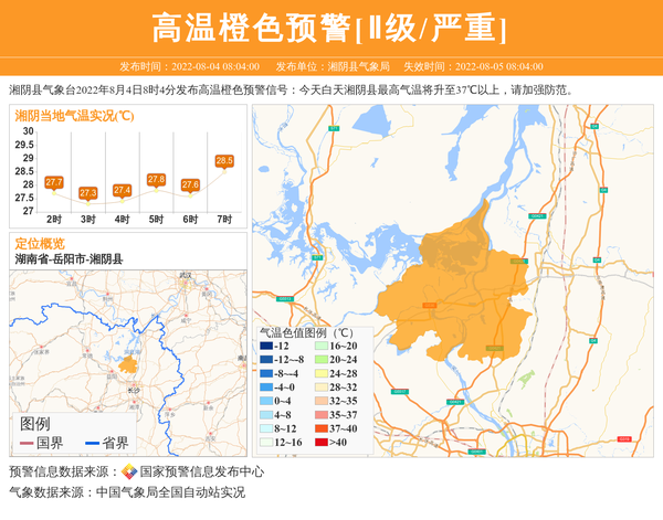 湘阴县气象台2022年8月4日8时4分发布高温橙色预警信号:今天白天湘阴县最高气温将升至37℃以上,请加强防范。 信息来源:国家预警信息发布中心; 发布单位:湘阴县气象局。