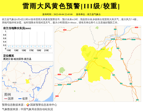 依兰县气象台发布雷雨大风黄色预警[III级/较重]