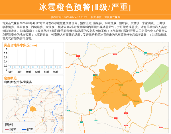 岢岚县气象台2022年8月4日17时57分发布冰雹橙色预警信号,预警区域: 温泉乡、水峪贯乡、阳坪乡、岚漪镇、宋家沟镇、三井镇、李家沟乡、高家会乡、西豹峪乡、大涧乡。 预计未来6小时预警区域内可能出现冰雹天气,并可能造成雹 灾。请有关单位和人员做好防范准备。 防御指南: 1.政府及相关部门按照职责做好防冰雹的应急和抢险工作; 2.气象部门适时开展人工防雹作业 3.户外行人立即到安全的地方暂避; 4.驱赶家禽、牲畜进入有顶蓬的场所,妥善保护易受冰雹袭击的汽车等室外物品或者设备; 5.注意防御冰雹天气伴随的雷电灾害。 信息来源:国家预警信息发布中心; 发布单位:岢岚县气象局。