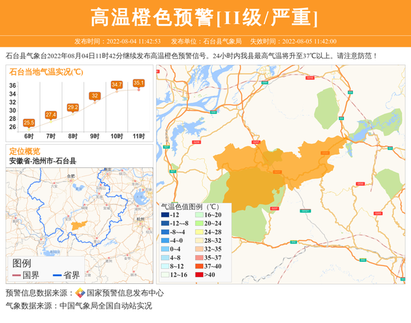 石台县气象台2022年08月04日11时42分继续发布高温橙色预警信号。24小时内我县最高气温将升至37℃以上。请注意防范! 信息来源:国家预警信息发布中心; 发布单位:石台县气象局。