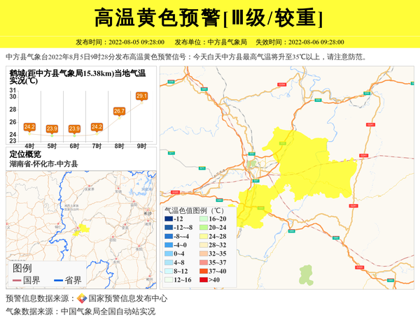 中方县气象台2022年8月5日9时28分发布高温黄色预警信号:今天白天中方县最高气温将升至35℃以上,请注意防范。 信息来源:国家预警信息发布中心; 发布单位:中方县气象局。