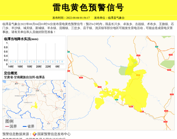 临潭县气象台2022年08月04日01时56分发布雷电黄色预警信号:预计6小时内,我县长川乡、卓洛乡、古战镇、术布乡、王旗镇、石门乡、羊沙镇、城关镇、新城镇、羊永镇、流顺镇、三岔乡、店子镇、洮滨镇等部分地区可能发生雷电活动,可能会造成雷电灾害事故。请有关单位和人员做好防范准备! 信息来源:国家预警信息发布中心; 发布单位:临潭县气象台。