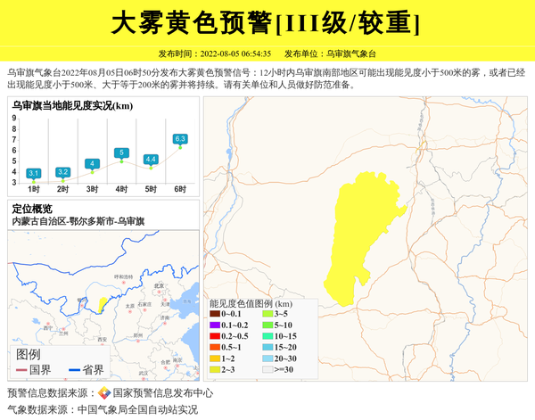 乌审旗气象台2022年08月05日06时50分发布大雾黄色预警信号:12小时内乌审旗南部地区可能出现能见度小于500米的雾,或者已经出现能见度小于500米、大于等于200米的雾并将持续。请有关单位和人员做好防范准备。 信息来源:国家预警信息发布中心; 发布单位:乌审旗气象台。