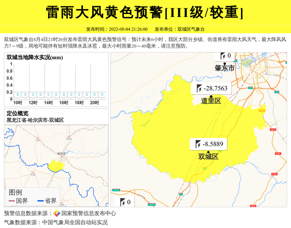 双城区气象台8月4日21时26分发布雷雨大风黄色预警信号:预计未来6小时,我区大部分乡镇、街道将有雷雨大风天气,最大阵风风力7~9级,局地可能伴有短时强降水及冰雹,最大小时雨量20~40毫米,请注意预防。 信息来源:国家预警信息发布中心; 发布单位:双城区气象台。