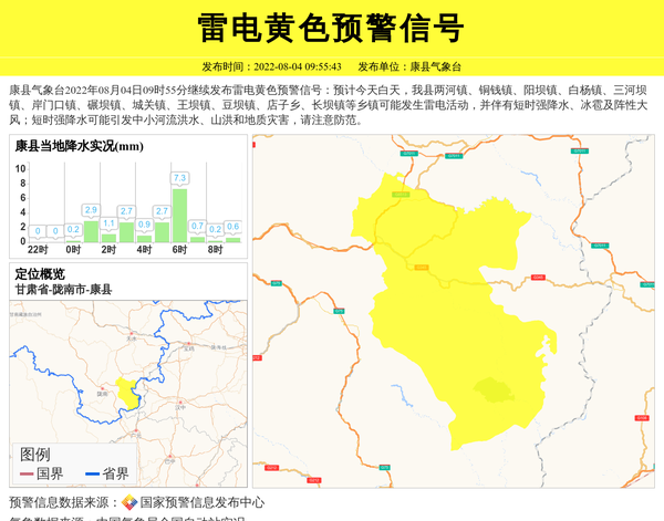 康县气象台2022年08月04日09时55分继续发布雷电黄色预警信号:预计今天白天,我县两河镇、铜钱镇、阳坝镇、白杨镇、三河坝镇、岸门口镇、碾坝镇、城关镇、王坝镇、豆坝镇、店子乡、长坝镇等乡镇可能发生雷电活动,并伴有短时强降水、冰雹及阵性大风;短时强降水可能引发中小河流洪水、山洪和地质灾害,请注意防范。 信息来源:国家预警信息发布中心; 发布单位:康县气象台。