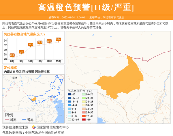 阿拉善右旗气象台2022年08月04日14时05分发布高温橙色预警信号:预计未来24小时内,塔木素布拉格苏木最高气温将升至37℃以上,阿拉腾敖包镇最高气温将升至35℃以上。请有关单位和人员做好防范准备。 信息来源:国家预警信息发布中心; 发布单位:阿拉善右旗气象台。