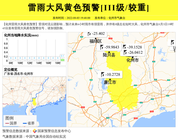 【化州雷雨大风黄色预警】受强对流云团影响,预计未来6小时我市有强雷雨,并伴有8级左右短时大风,化州市气象台8月3日19时45分发布雷雨大风黄色预警信号,请加强防御。 信息来源:国家预警信息发布中心; 发布单位:化州市气象台。