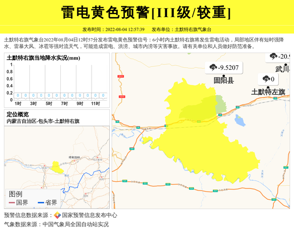土默特右旗气象台2022年08月04日12时57分发布雷电黄色预警信号:6小时内土默特右旗将发生雷电活动,局部地区伴有短时强降水、雷暴大风、冰雹等强对流天气,可能造成雷电、洪涝、城市内涝等灾害事故。请有关单位和人员做好防范准备。 信息来源:国家预警信息发布中心; 发布单位:土默特右旗气象台。