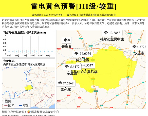 内蒙古通辽市科尔沁左翼后旗气象台2022年08月04日20时37分继续发布2022年08月04日14时41分发布的雷电黄色预警信号:6小时内科尔沁左翼后旗可能发生雷电活动,局部地区伴有短时强降水、雷暴大风、冰雹等强对流天气,可能造成雷电、洪涝、城市内涝等灾害事故。请有关单位和人员做好防范准备。 信息来源:国家预警信息发布中心; 发布单位:内蒙古通辽市科尔沁左翼后旗气象台。