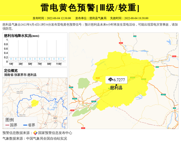 慈利县气象台2022年8月4日12时38分发布雷电黄色预警信号:预计慈利县未来6小时将发生雷电活动,可能出现雷电灾害事故,请加强防范。 信息来源:国家预警信息发布中心; 发布单位:慈利县气象局。
