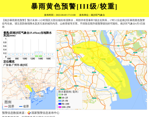 【南沙暴雨黄色预警】预计未来1-2小时我区大部分镇街有强降水,局部伴有雷暴和7级左右阵风,17时12分起南沙区暴雨黄色预警信号生效。请注意防御强降水及其引发的城市内涝、山体滑坡等灾害。不排除后期升级预警级别的可能性。南沙区气象台8月3日发布 信息来源:国家预警信息发布中心; 发布单位:南沙区气象台。