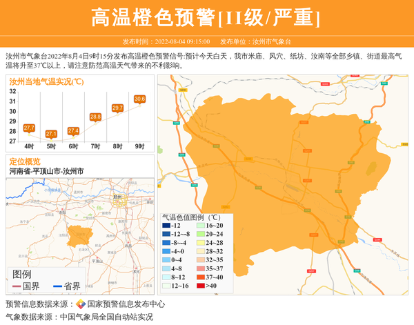 汝州市气象台2022年8月4日9时15分发布高温橙色预警信号:预计今天白天,我市米庙、风穴、纸坊、汝南等全部乡镇、街道最高气温将升至37℃以上,请注意防范高温天气带来的不利影响。 信息来源:国家预警信息发布中心; 发布单位:汝州市气象台。