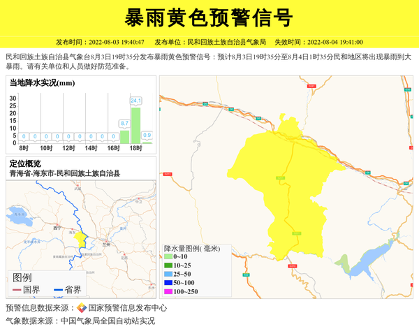 民和回族土族自治县气象台8月3日19时35分发布暴雨黄色预警信号:预计8月3日19时35分至8月4日1时35分民和地区将出现暴雨到大暴雨。请有关单位和人员做好防范准备。 信息来源:国家预警信息发布中心; 发布单位:民和回族土族自治县气象局。