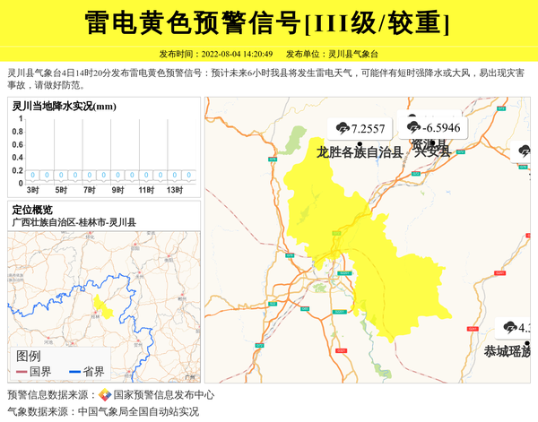 灵川县气象台4日14时20分发布雷电黄色预警信号:预计未来6小时我县将发生雷电天气,可能伴有短时强降水或大风,易出现灾害事故,请做好防范。 信息来源:国家预警信息发布中心; 发布单位:灵川县气象台。