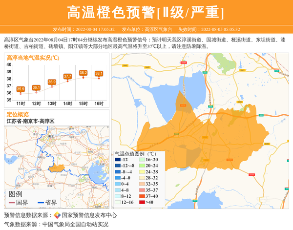高淳区气象台2022年08月04日17时04分继续发布高温橙色预警信号:预计明天我区淳溪街道、固城街道、桠溪街道、东坝街道、漆桥街道、古柏街道、砖墙镇、阳江镇等大部分地区最高气温将升至37℃以上,请注意防暑降温。 信息来源:国家预警信息发布中心; 发布单位:高淳区气象台。