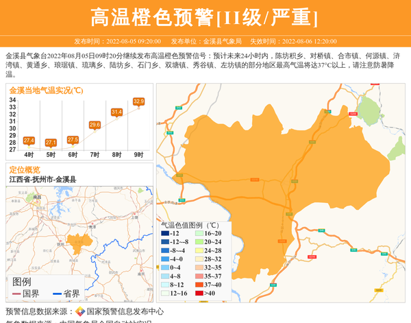 金溪县气象台2022年08月05日09时20分继续发布高温橙色预警信号:预计未来24小时内,陈坊积乡、对桥镇、合市镇、何源镇、浒湾镇、黄通乡、琅琚镇、琉璃乡、陆坊乡、石门乡、双塘镇、秀谷镇、左坊镇的部分地区最高气温将达37°C以上,请注意防暑降温。 信息来源:国家预警信息发布中心; 发布单位:金溪县气象局。