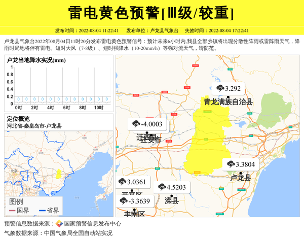 卢龙县气象台2022年08月04日11时20分发布雷电黄色预警信号:预计未来6小时内,我县全部乡镇将出现分散性阵雨或雷阵雨天气,降雨时局地将伴有雷电、短时大风(7-8级)、短时强降水(10-20mm/h)等强对流天气,请防范。 信息来源:国家预警信息发布中心; 发布单位:卢龙县气象台。