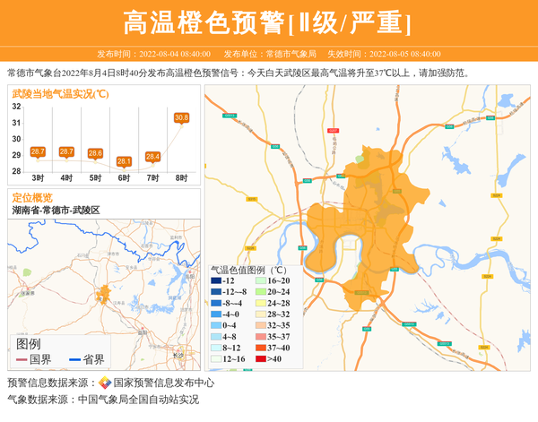 常德市气象台2022年8月4日8时40分发布高温橙色预警信号:今天白天武陵区最高气温将升至37℃以上,请加强防范。 信息来源:国家预警信息发布中心; 发布单位:常德市气象局。