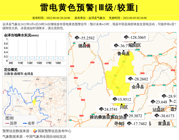 会泽县气象台2022年8月4日20时24分继续发布雷电黄色预警信号:预计未来6小时,我县中部及南部将发生雷电活动,可能伴有6至7级阵性大风、冰雹或短时强降水,请注意防范。 信息来源:国家预警信息发布中心; 发布单位:会泽县气象台。