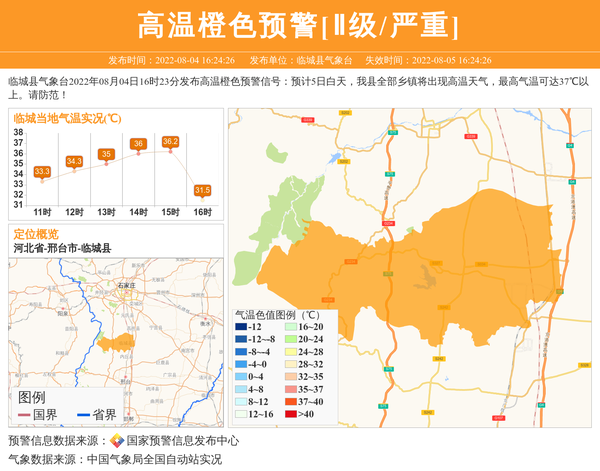 临城县气象台2022年08月04日16时23分发布高温橙色预警信号:预计5日白天,我县全部乡镇将出现高温天气,最高气温可达37℃以上。请防范! 信息来源:国家预警信息发布中心; 发布单位:临城县气象台。