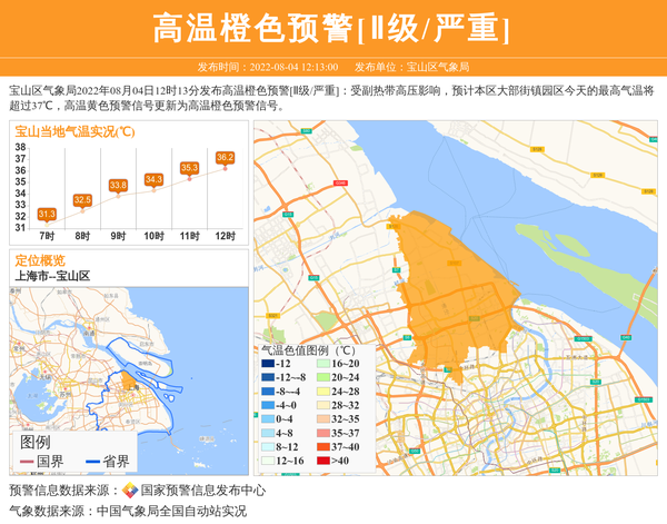 宝山区气象局2022年08月04日12时13分发布高温橙色预警[Ⅱ级/严重]:受副热带高压影响,预计本区大部街镇园区今天的最高气温将超过37℃,高温黄色预警信号更新为高温橙色预警信号。 信息来源:国家预警信息发布中心; 发布单位:宝山区气象局。