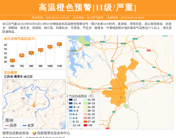 余江区气象台2022年08月04日11时45分继续发布高温橙色预警信号:预计未来24小时内,春涛镇、邓埠街道、高公寨营林场、洪湖乡、画桥镇、黄庄乡、潢溪镇、锦江镇、刘家站乡、马荃镇、平定乡、杨溪乡、中童镇的部分地区最高气温将达37°C以上,请注意防暑降温。 信息来源:国家预警信息发布中心; 发布单位:余江区气象局。