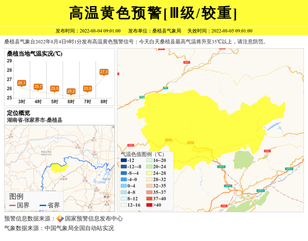 桑植县气象台2022年8月4日9时1分发布高温黄色预警信号:今天白天桑植县最高气温将升至35℃以上,请注意防范。 信息来源:国家预警信息发布中心; 发布单位:桑植县气象局。