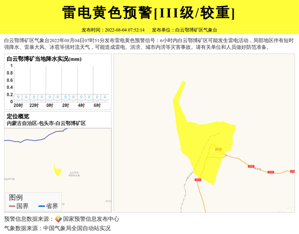 白云鄂博矿区气象台2022年08月04日07时51分发布雷电黄色预警信号:6小时内白云鄂博矿区可能发生雷电活动,局部地区伴有短时强降水、雷暴大风、冰雹等强对流天气,可能造成雷电、洪涝、城市内涝等灾害事故。请有关单位和人员做好防范准备。 信息来源:国家预警信息发布中心; 发布单位:白云鄂博矿区气象台。