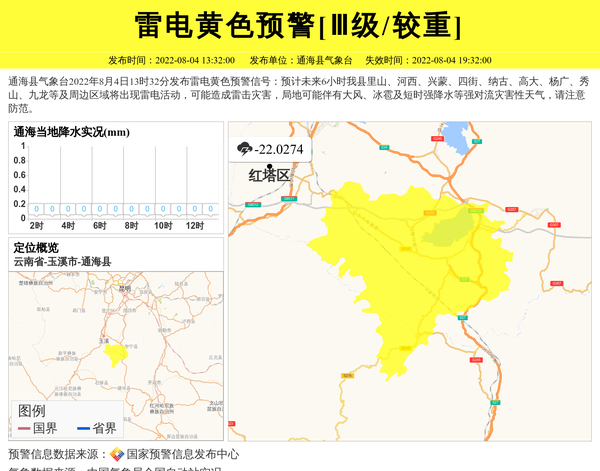通海县气象台2022年8月4日13时32分发布雷电黄色预警信号:预计未来6小时我县里山、河西、兴蒙、四街、纳古、高大、杨广、秀山、九龙等及周边区域将出现雷电活动,可能造成雷击灾害,局地可能伴有大风、冰雹及短时强降水等强对流灾害性天气,请注意防范。 信息来源:国家预警信息发布中心; 发布单位:通海县气象台。