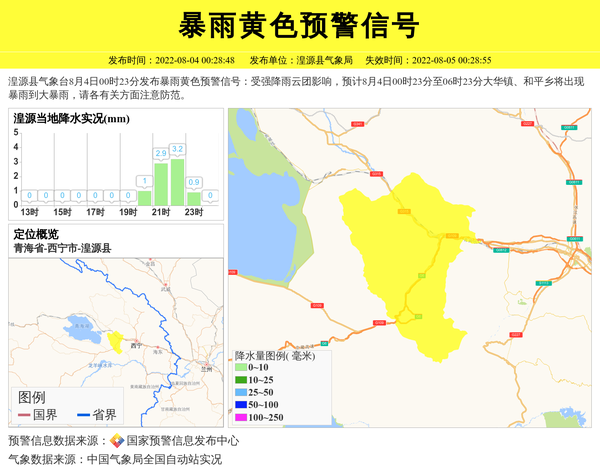 湟源县气象台8月4日00时23分发布暴雨黄色预警信号:受强降雨云团影响,预计8月4日00时23分至06时23分大华镇、和平乡将出现暴雨到大暴雨,请各有关方面注意防范。 信息来源:国家预警信息发布中心; 发布单位:湟源县气象局。