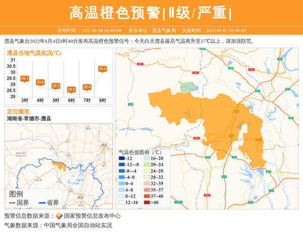 澧县气象台2022年8月4日8时40分发布高温橙色预警信号:今天白天澧县最高气温将升至37℃以上,请加强防范。 信息来源:国家预警信息发布中心; 发布单位:澧县气象局。