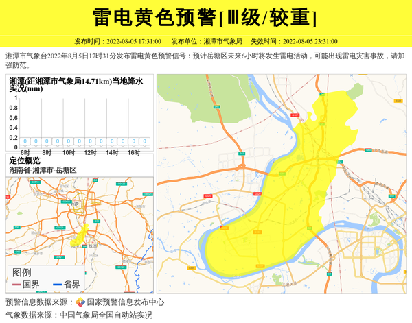 湘潭市气象台2022年8月5日17时31分发布雷电黄色预警信号:预计岳塘区未来6小时将发生雷电活动,可能出现雷电灾害事故,请加强防范。 信息来源:国家预警信息发布中心; 发布单位:湘潭市气象局。
