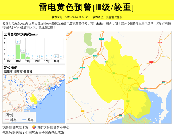 云霄县气象台2022年08月03日21时01分继续发布雷电黄色预警信号:预计未来6小时内,我县部分乡镇将发生雷电活动,局地伴有短时强降水和6-8级雷雨大风。请注意防范! 信息来源:国家预警信息发布中心; 发布单位:云霄县气象台。