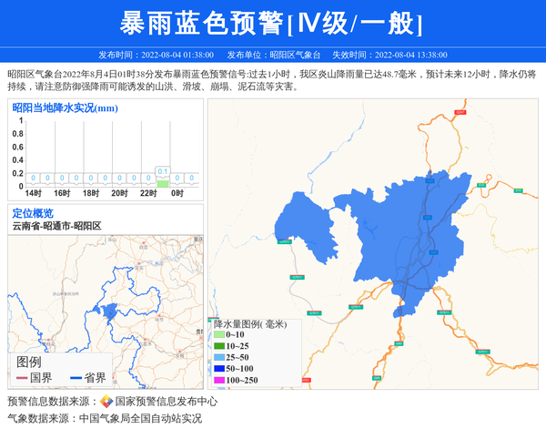 昭阳区气象台2022年8月4日01时38分发布暴雨蓝色预警信号:过去1小时,我区炎山降雨量已达48.7毫米,预计未来12小时,降水仍将持续,请注意防御强降雨可能诱发的山洪、滑坡、崩塌、泥石流等灾害。 信息来源:国家预警信息发布中心; 发布单位:昭阳区气象台。