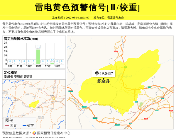 普定县气象台继续发布雷电黄色预警信号[Ⅲ/较重]