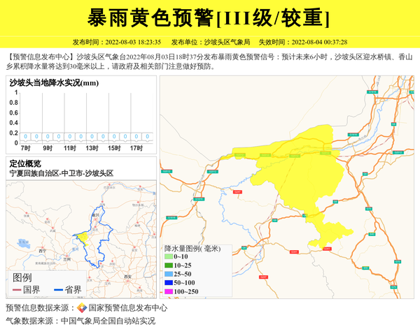 【预警信息发布中心】沙坡头区气象台2022年08月03日18时37分发布暴雨黄色预警信号:预计未来6小时,沙坡头区迎水桥镇、香山乡累积降水量将达到30毫米以上,请政府及相关部门注意做好预防。 信息来源:国家预警信息发布中心; 发布单位:沙坡头区气象局。