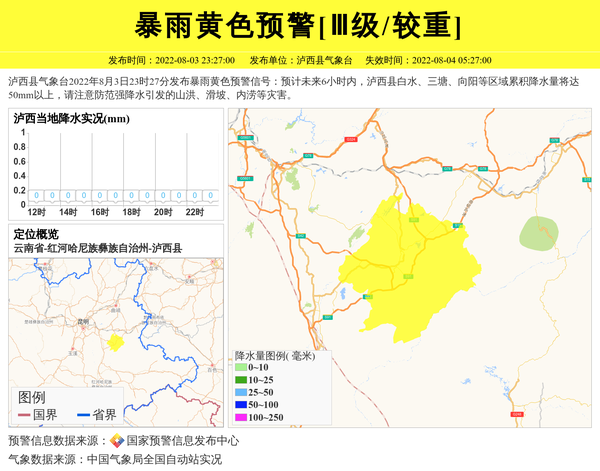 泸西县气象台2022年8月3日23时27分发布暴雨黄色预警信号:预计未来6小时内,泸西县白水、三塘、向阳等区域累积降水量将达50mm以上,请注意防范强降水引发的山洪、滑坡、内涝等灾害。 信息来源:国家预警信息发布中心; 发布单位:泸西县气象台。