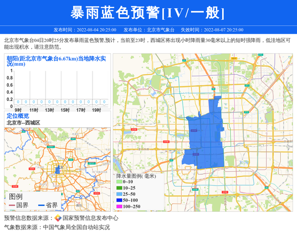 北京市气象台04日20时25分发布暴雨蓝色预警,预计,当前至23时,西城区将出现小时降雨量30毫米以上的短时强降雨,低洼地区可能出现积水,请注意防范。 信息来源:国家预警信息发布中心; 发布单位:北京市气象台。