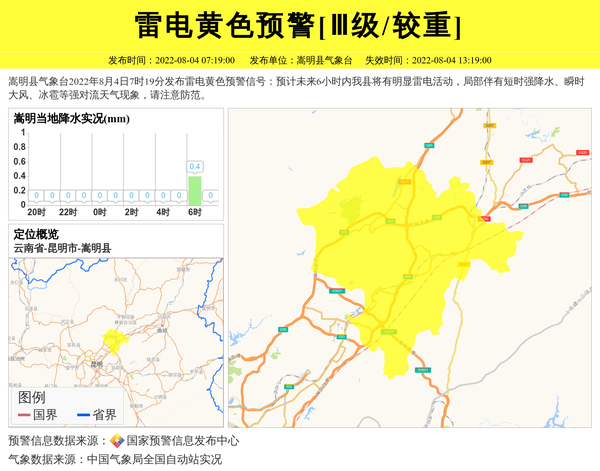 嵩明县气象台2022年8月4日7时19分发布雷电黄色预警信号:预计未来6小时内我县将有明显雷电活动,局部伴有短时强降水、瞬时大风、冰雹等强对流天气现象,请注意防范。 信息来源:国家预警信息发布中心; 发布单位:嵩明县气象台。