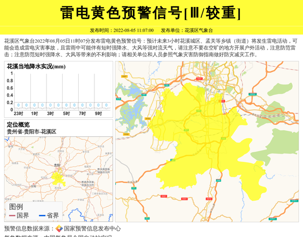 花溪区气象台2022年08月05日11时07分发布雷电黄色预警信号:预计未来3小时花溪城区、孟关等乡镇(街道)将发生雷电活动,可能会造成雷电灾害事故,且雷雨中可能伴有短时强降水、大风等强对流天气,请注意不要在空旷的地方开展户外活动,注意防范雷击;注意防范短时强降水、大风等带来的不利影响;请相关单位和人员参照气象灾害防御指南做好防灾减灾工作。 信息来源:国家预警信息发布中心; 发布单位:花溪区气象台。