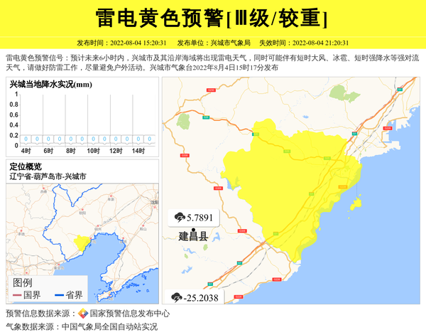 雷电黄色预警信号:预计未来6小时内,兴城市及其沿岸海域将出现雷电天气,同时可能伴有短时大风、冰雹、短时强降水等强对流天气,请做好防雷工作,尽量避免户外活动。兴城市气象台2022年8月4日15时17分发布 信息来源:国家预警信息发布中心; 发布单位:兴城市气象局。