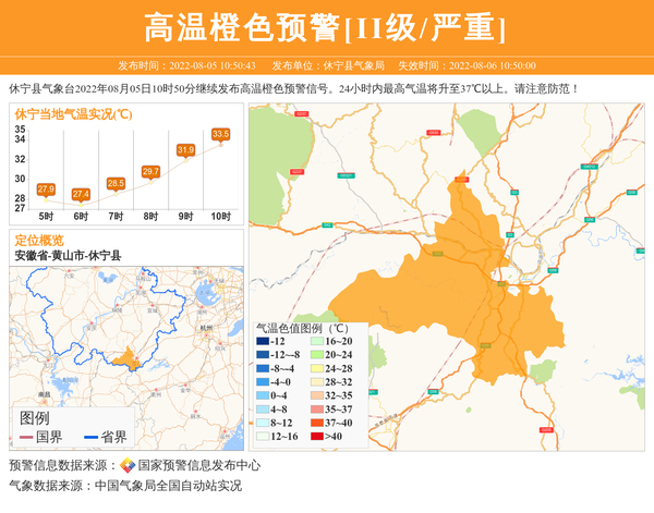 休宁县气象台2022年08月05日10时50分继续发布高温橙色预警信号。24小时内最高气温将升至37℃以上。请注意防范! 信息来源:国家预警信息发布中心; 发布单位:休宁县气象局。