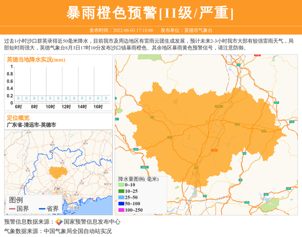 过去1小时沙口群英录得近50毫米降水,目前我市及周边地区有雷雨云团生成发展,预计未来2-3小时我市大部有较强雷雨天气,局部短时雨强大,英德气象台8月3日17时10分发布沙口镇暴雨橙色、其余地区暴雨黄色预警信号,请注意防御。 信息来源:国家预警信息发布中心; 发布单位:英德市气象台。