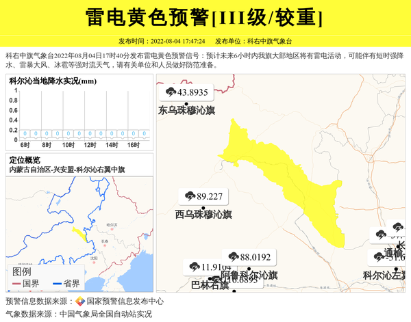 科右中旗气象台2022年08月04日17时40分发布雷电黄色预警信号:预计未来6小时内我旗大部地区将有雷电活动,可能伴有短时强降水、雷暴大风、冰雹等强对流天气,请有关单位和人员做好防范准备。 信息来源:国家预警信息发布中心; 发布单位:科右中旗气象台。