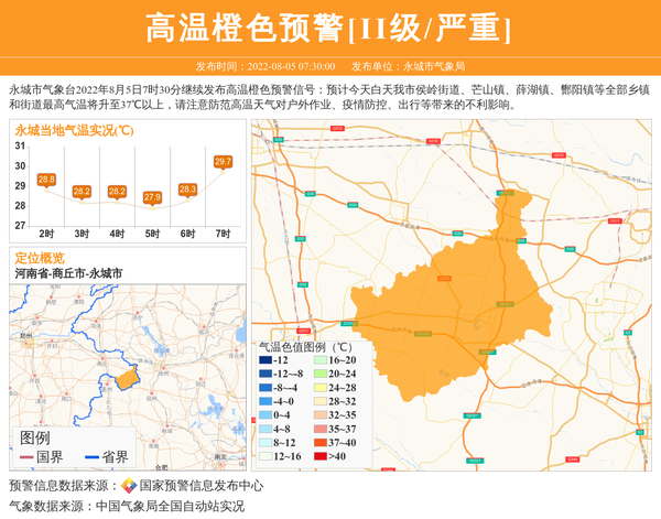 永城市气象台2022年8月5日7时30分继续发布高温橙色预警信号:预计今天白天我市侯岭街道、芒山镇、薛湖镇、酂阳镇等全部乡镇和街道最高气温将升至37℃以上,请注意防范高温天气对户外作业、疫情防控、出行等带来的不利影响。 信息来源:国家预警信息发布中心; 发布单位:永城市气象局。