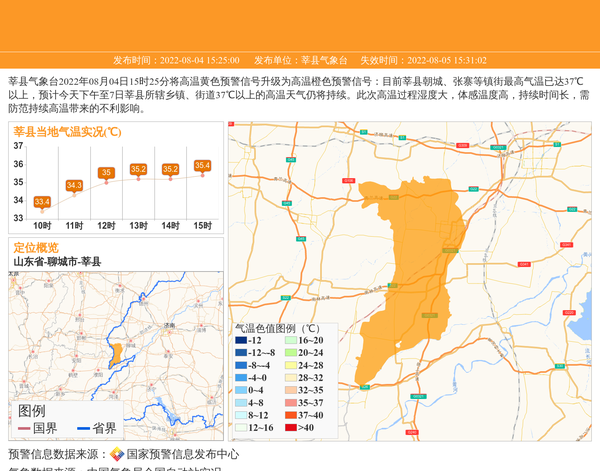 莘县气象台2022年08月04日15时25分将高温黄色预警信号升级为高温橙色预警信号:目前莘县朝城、张寨等镇街最高气温已达37℃以上,预计今天下午至7日莘县所辖乡镇、街道37℃以上的高温天气仍将持续。此次高温过程湿度大,体感温度高,持续时间长,需防范持续高温带来的不利影响。 信息来源:国家预警信息发布中心; 发布单位:莘县气象台。