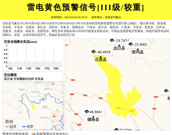 甘孜县气象台2022年08月04日20时10分对2022年08月04日15时19分发布的雷电黄色预警信号进行第1次确认:预计来马镇、查龙镇、甘孜镇、卡龙乡、大德乡、茶扎乡、泥柯乡、夺多乡、四通达乡、下雄乡、庭卡乡、拖坝乡、仁果乡、卡攻乡、昔色乡、扎科乡、贡隆乡、生康乡、南多乡、色西底乡、呷拉乡等乡镇未来6小时内可能发生雷电活动,可能会造成雷电灾害事故。局地可能伴有短时强降水、冰雹、大风等强对流天气,需做好安全防范工作。 信息来源:国家预警信息发布中心; 发布单位:甘孜县气象台。