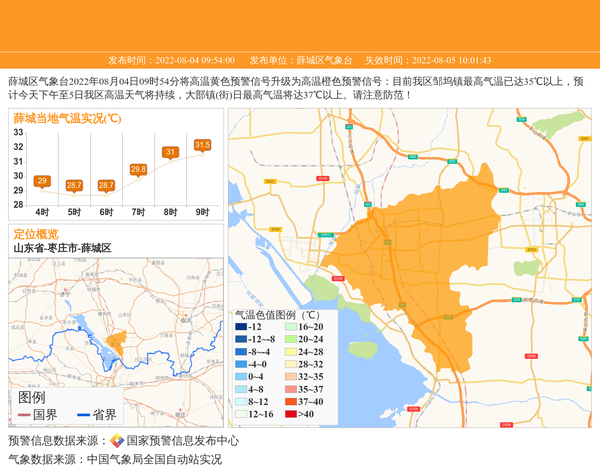 薛城区气象台2022年08月04日09时54分将高温黄色预警信号升级为高温橙色预警信号:目前我区邹坞镇最高气温已达35℃以上,预计今天下午至5日我区高温天气将持续,大部镇(街)日最高气温将达37℃以上。请注意防范! 信息来源:国家预警信息发布中心; 发布单位:薛城区气象台。